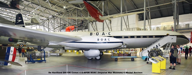 El Comet 4 G-APDB que realizo el vuelo entre Nueva York y Londres en 6 horas y 11 minutos, sin escalas intermediarias, esta conservado en el Imperial War Museum de Duxford.