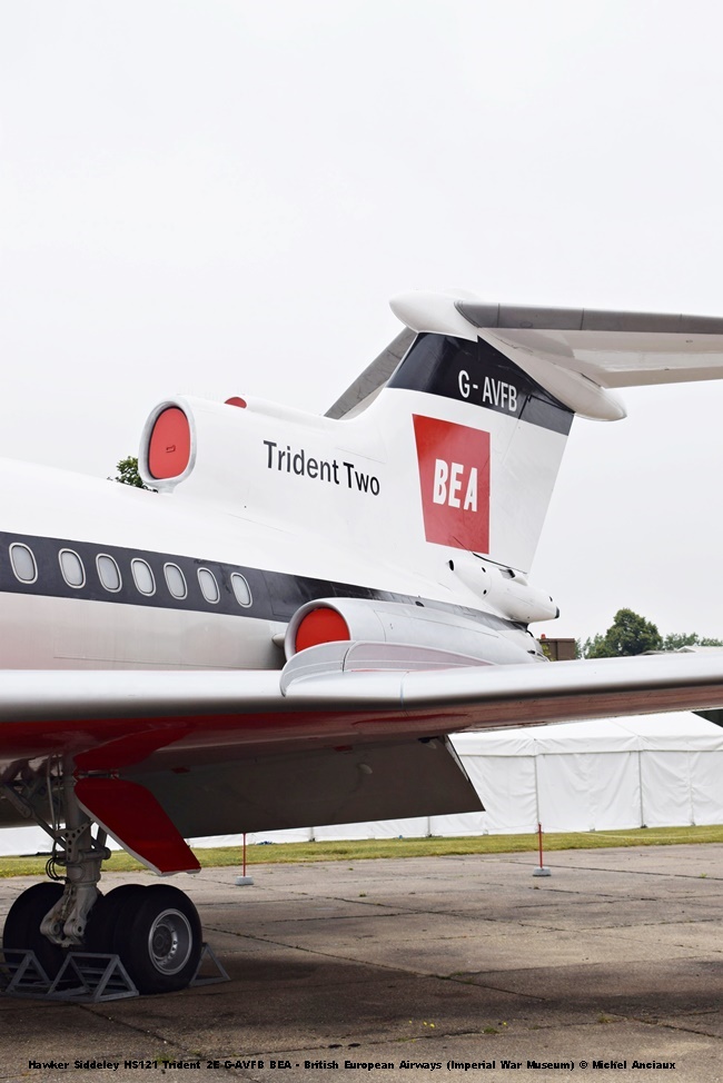 Next up was the Trident 2E with the Mk512 version of the Spey putting out 53.1 kN (11,930 lbst) for a cruising speed of 970 km / h (525 kt).Its flight range was also increased thanks to the provision of an additional fuel tank placed this time in the tail, passing at 3 860 km (2 400 ms), for the same passenger capacity.