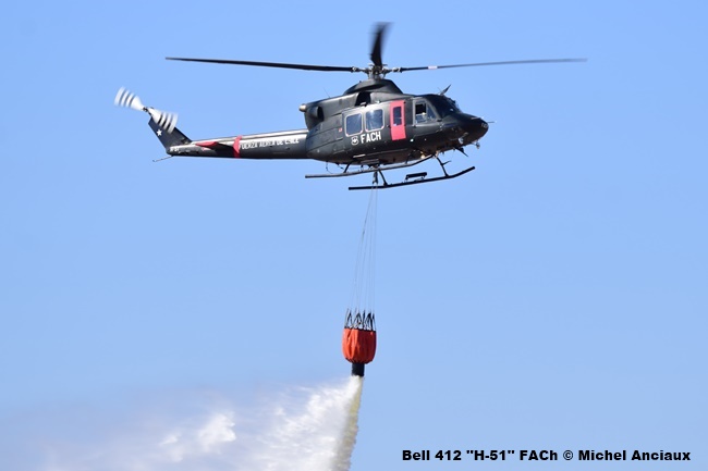 A Bell 412, this one being equipped with a Bambi bucket (bag to transport water) to demonstrate its firefighting skills, and a Sikorsky MH-60M Black Hawk participated in the demonstrations.
